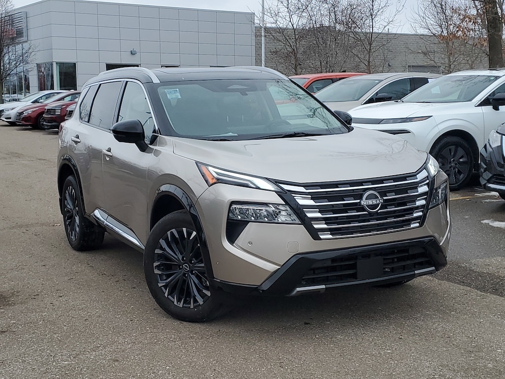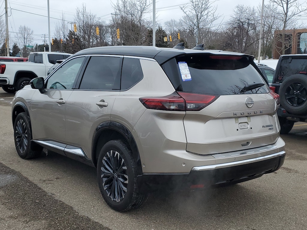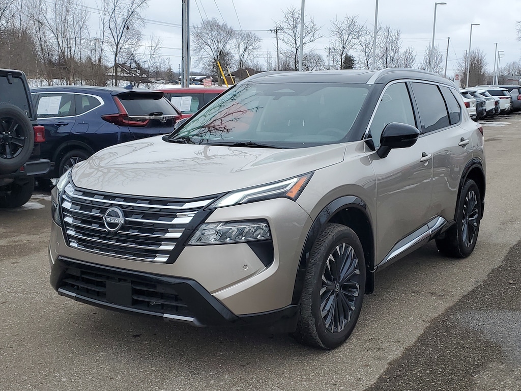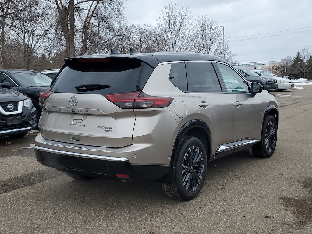 Champagne Silver Metallic/Super Black 2025 Nissan Rogue Platinum AWD CVT with Xtronic 1.5L DOHC AWD, 10 Speakers, 4-Wheel Disc Brakes, ABS brakes, Air Conditioning, Alloy wheels, Auto High-beam Headlights, Auto-dimming Rear-View mirror, Automatic temperature control, Brake assist, Bumpers: body-color, Chrome Rear Bumper Protector, Delay-off headlights, Driver door bin, Driver vanity mirror, Dual front impact airbags, Dual front side impact airbags, Electronic Stability Control, Emergency communication system: NissanConnect Services, First Aid Kit, Four wheel independent suspension, Front anti-roll bar, Front Bucket Seats, Front Center Armrest, Front dual zone A/C, Front reading lights, Fully automatic headlights, Garage door transmitter: myQ Connected Garage, Head-Up Display, Heated door mirrors, Heated front seats, Heated Rear Seats, Heated steering wheel, Illuminated entry, Knee airbag, Low tire pressure warning, Memory seat, Motion-Activated Power Liftgate, Occupant sensing airbag, Outside temperature display, Overhead airbag, Overhead console, Panic alarm, Passenger door bin, Passenger vanity mirror, Platinum Premium Package, Power door mirrors, Power driver seat, Power Liftgate, Power moonroof, Power passenger seat, Power steering, Power windows, Radio data system, Rain-Sensing Wipers, Rear anti-roll bar, Rear Door Sunshades, Rear reading lights, Rear seat center armrest, Rear side impact airbag, Rear window defroster, Rear window wiper, Remote keyless entry, Security system, Speed control, Speed-sensing steering, Speed-Sensitive Wipers, Split folding rear seat, Spoiler, Steering wheel mounted audio controls, Tachometer, Tech Package, Telescoping steering wheel, Tilt steering wheel, Traction control, Tri-Zone Automatic Temperature Control, Trip computer, Turn signal indicator mirrors, USB Charging Cable Set - Nissan, Variably intermittent wipers, AWD.