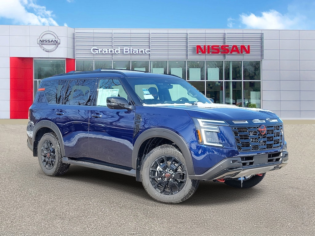 Deep Ocean Blue Pearl 2026 Nissan Armada PRO-4X 4WD 9-Speed Automatic 3.5L DOHC 4WD, 12 Speakers, 2nd Row Center Console with Two Cupholders, 2nd Row Outboard Captain's Chairs with Armrests, 3rd row seats: split-bench, 4-Wheel Disc Brakes, ABS brakes, Adaptive suspension, Air Conditioning, Alloy wheels, AM/FM radio: SiriusXM w/360L, Anti-whiplash front head restraints, Apple CarPlay/Android Auto, Auto High-beam Headlights, Auto tilt-away steering wheel, Auto-dimming door mirrors, Auto-dimming Rear-View mirror, Auto-leveling suspension, Automatic temperature control, Biometric Cooling, Brake assist, Bumpers: body-color, Captain's Chair Seat Package, Climate Controlled Heated and Ventilated Front Seats, Compass, Cross Bars, Delay-off headlights, Driver door bin, Driver vanity mirror, Dual front impact airbags, Dual front side impact airbags, Electronic Stability Control, Emergency communication system: NissanConnect Services, EZ Flex Second Row Seating System with One Touch Release, Four wheel independent suspension, Front anti-roll bar, Front Bucket Seats, Front Center Armrest, Front dual zone A/C, Front fog lights, Front reading lights, Front Tow Hooks, Fully automatic headlights, Garage door transmitter: myQ Connected Garage, Genuine wood dashboard insert, Hands-Free Power Liftgate, Heated 2nd Row Seats, Heated door mirrors, Heated Front Bucket Seats, Heated front seats, Heated steering wheel, HVAC memory, Illuminated entry, Illuminated Kick Plates, in-Car Camera, Intelligent Dash Cam, Intelligent Rear View Mirror (I-RVM), Knee airbag, Leather steering wheel, Low tire pressure warning, Memory seat, Navigation system: Google Maps, Occupant sensing airbag, Outside temperature display, Overhead airbag, Overhead console, Panic alarm, Panoramic Moonroof, Passenger door bin, Passenger vanity mirror, Power door mirrors, Power driver seat, Power Liftgate, Power passenger seat, Power steering, Power windows, PRO-4X Carpeted Floor Mats with Captain's Chair, Pro-4x Leather Quilted Insert Seat Trim, PRO-4X Mud Guards, PRO-4X Premium Package with Captain's Chair, Radio: NissanConnect with SiriusXM 360L, Rain sensing wipers, Rear air conditioning, Rear anti-roll bar, Rear Bumper Protector, Rear reading lights, Rear seat center armrest, Rear window defroster, Rear window wiper, Reclining 3rd row seat, Remote keyless entry, Security system, Speed control, Speed-sensing steering, Speed-Sensitive Wipers, Split folding rear seat, Spoiler, Steering wheel memory, Steering wheel mounted audio controls, Tachometer, Telescoping steering wheel, Tilt steering wheel, Traction control, Trip computer, Turn signal indicator mirrors, Variably intermittent wipers, Voltmeter, Wheels: 20" x 8.5J Painted PRO-4X Alloy, 4WD.